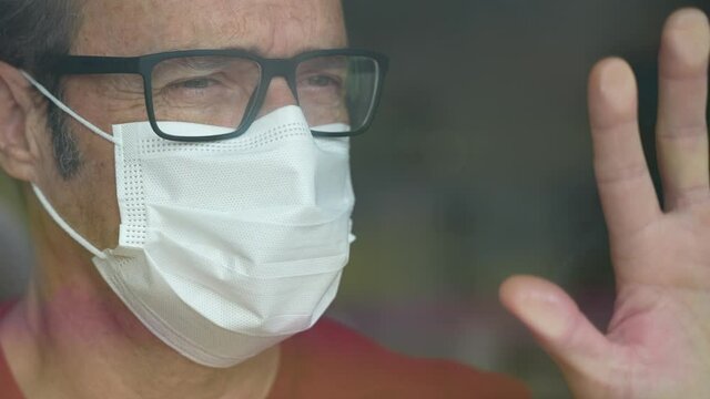 Closeup of a handsome mature man with glasses and a face mask looking resigned sadly through a window with a hand on the glass due to Coronavirus Covid-19 pandemic, quarantine, social distancing.