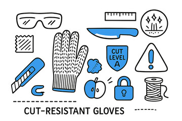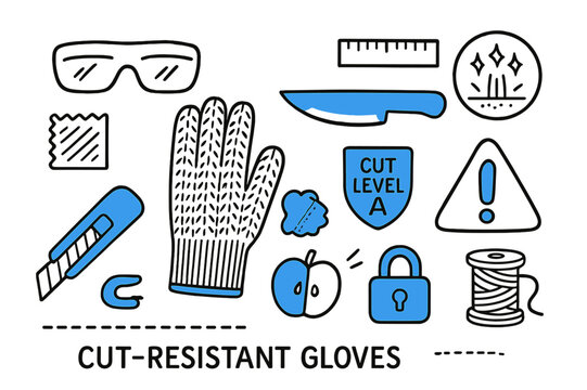 Cut-Resistant Gloves Doodle. // Cut-resistant gloves. Hand-drawn doodle illustration cut-resistant gloves [glove pair with knit texture (accented), knife blade