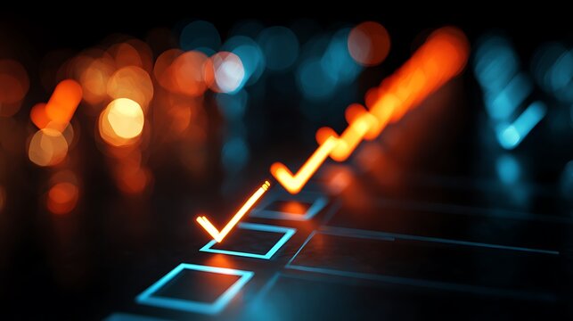 Glowing checkmarks on a checklist, symbolizing completion against a blurred background