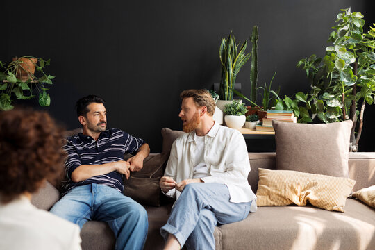 Couple engaged in heartfelt conversation on sofa