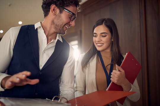 Young colleagues having conversation in the break at the conference in the hotel. Hotel, business, people