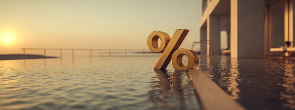 golden percent symbol placed beside a modern infinity pool with a serene sunset view, concept of luxury, finance and summer vacation. banner