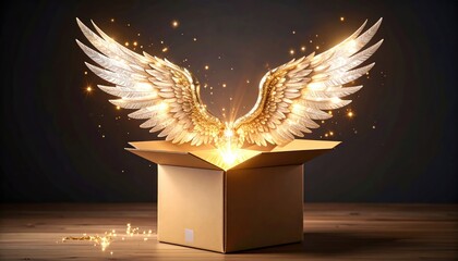 Unveiling of Celestial Gift: A box opens, revealing resplendent golden wings, glowing with divine light, symbolizing opportunity, faith, and the extraordinary within.