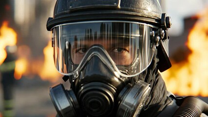 Firefighter in protective gear responds to emergency at a blaze in an industrial area during daytime operations