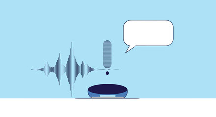 Smart speaker assistant responds to a voice command shown as a sound wave with an alert and a blank speech bubble for text.