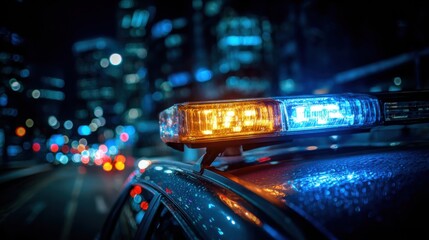 A police car with flashing blue and orange lights responds to an emergency. The city skyline looms in the background, showcasing a vibrant nightlife atmosphere.