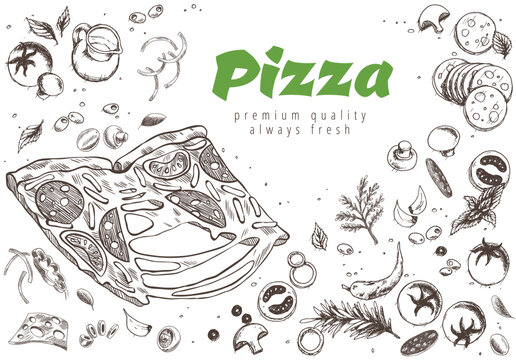 Pizza line banner. Engraved style doodle background. Savoury pizza ads. Tasty vector banner for cafe, restaurant or food delivery service
