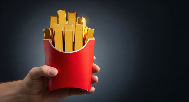 A hand holding a red carton of french fries that are shaped like shiny gold bars a creative advertising concept for a valuable meal deal or a promotion at a fast food restaurant on a simple background