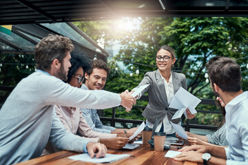 Business, woman and handshake with documents at cafe for finance meeting, welcome and greeting of project. People, paperwork or partnership of onboarding, contract and opportunity deal at coffee shop