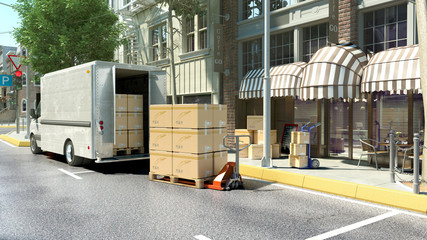 Diverse of paper containers for takeaway food. Delivery man is carrying