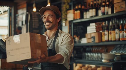A restaurant worker eagerly receives a delivery of beverages from a supplier showcasing the moment of anticipation as the boxes are brought into the establishment : Generative AI