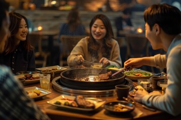 A Korean BBQ restaurant scene where diners grill their own meat at the table, engaging in a fun and interactive culinary experience.