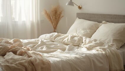 A cozy bedroom at night with soft lighting and fluffy pillows, promoting restful sleep.