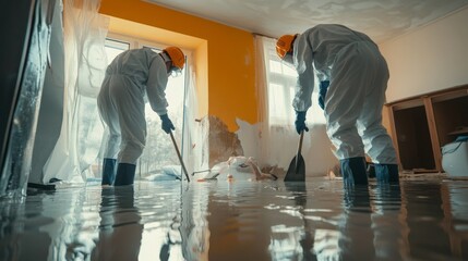 Two workers in protective suits are cleaning up water in a flooded room, illustrating a restoration effort in a residential space.