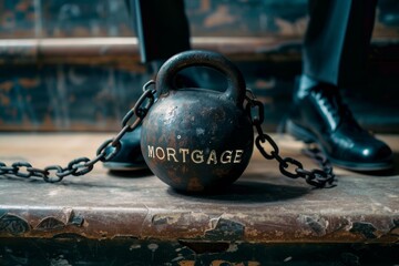 Debt symbol: Man restrained by mortgage kettlebell close-up