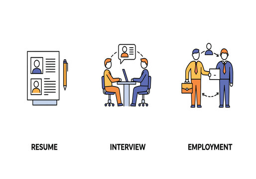 Job application process icons showing resume building interview and successful employment with handshake and offer letter