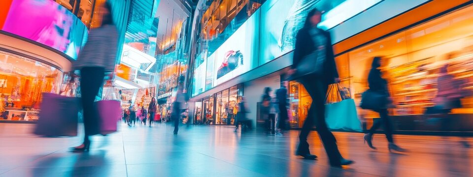Busy shopping mall with blurred shoppers walking under bright digital billboards