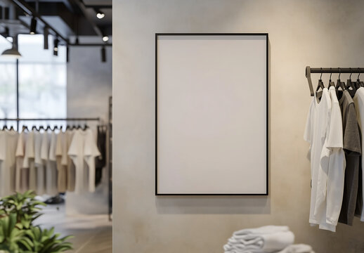 Large vertical blank poster mockup in a stylish clothing store with modern interior design, ideal for branding, promotions, and retail advertising
