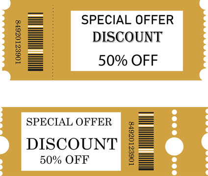 Golden special offer discount ticket coupon with barcode, 50 percent off sale voucher design template