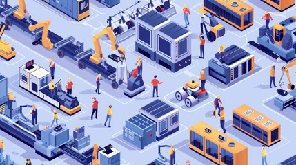 This isometric illustration presents a smart industrial factory, highlighting automated production lines and engineering teamwork in the manufacturing sector.