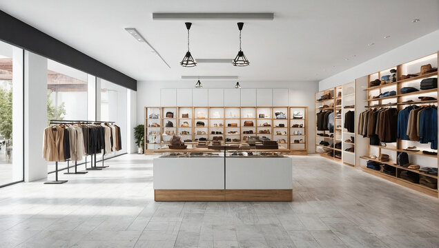 clothing boutique inside a bright shopping mall, featuring a spacious and sophisticated interior with a clear glass facade, retail store displaying a luxury collection of contemporary urban outfits