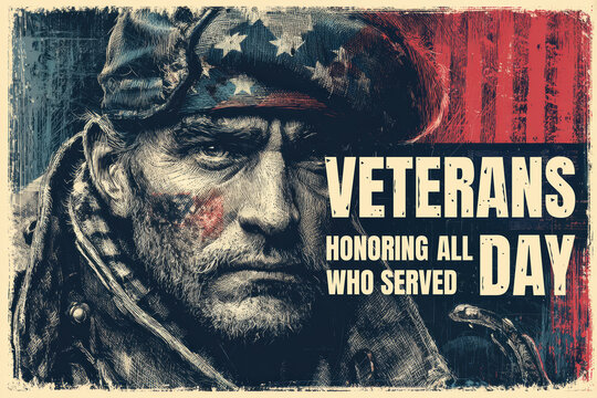 Veterans Day Banner. Powerful grunge tribute honoring Veterans Day. Features a solemn senior veteran wearing a patriotic cap, with distressed American flag