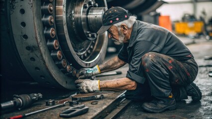 A closeup of hands of various retirees covered in grease and paint as they work on repairing a large machine on the factory floor. The intensity of their activity reveals their
