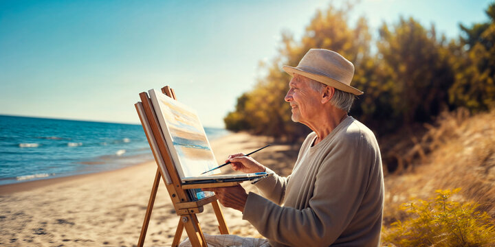 Retired pensioner having an active hobby painting on a beautiful day on the beach full of wellness and joy in their retirement
