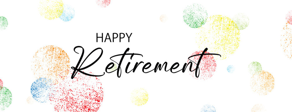 Happy retirement sign over colorful round dots confetti background.