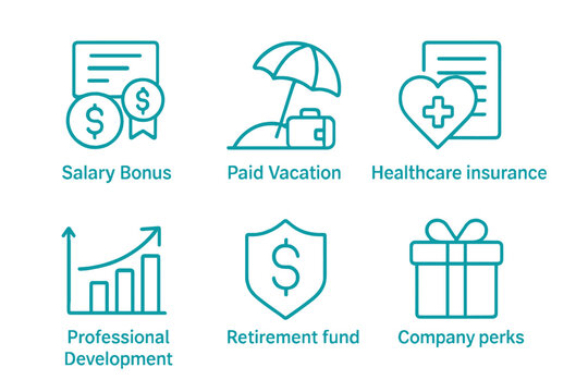Corporate benefits vector illustration set in neon style for workplace incentives