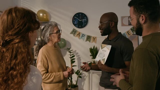 Group of diverse managers congratulating their senior female coworker with retirement day in office decorated with banner and balloons