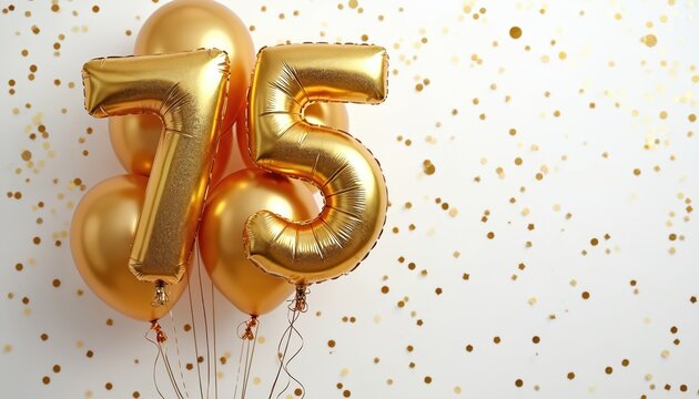 Gold number 75 balloons float near other gold balloons. Golden confetti scatters on white background. Celebrate milestone anniversary event or birthday. Festive party decoration.