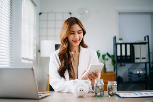 Asian woman saving for retirement Saving money through a piggy bank and taking notes in modern office