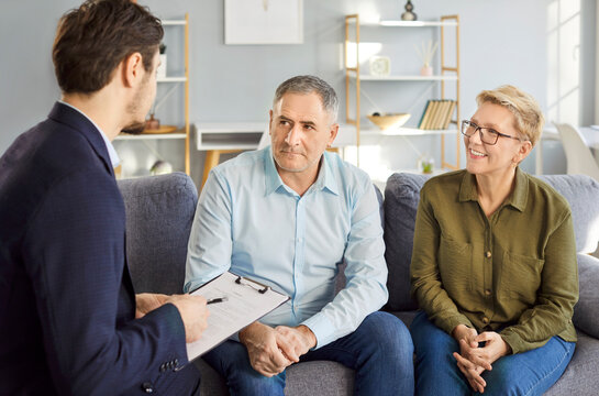 Professional consultant or agent holding a meeting with couple of senior clients in an office, discussing insurance, financial investments, and providing assistance for future plans.