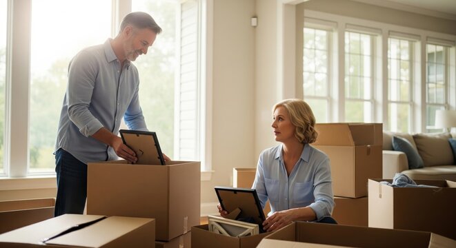 Woman packing clothes into a cardboard box for moving or donation. Relocation, storage, or charity concept with neatly folded garments.