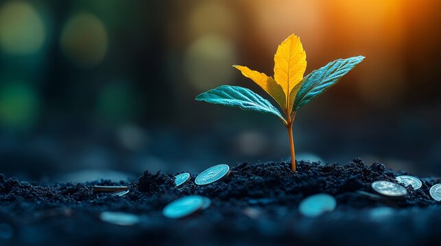 Stacks of coins with green plants growing. Concept of business growth investment, financial success. Coins symbolize money, savings, profit. Plants represent development, sustainability, future