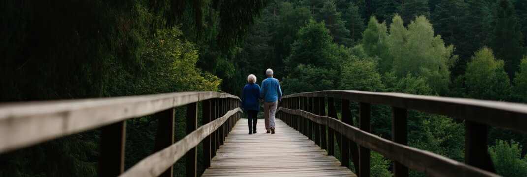 An elderly couple is walking hand in hand on a wooden bridge surrounded by lush greenery and nature.
