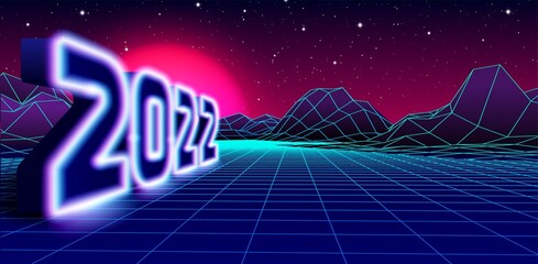 2022 neon sign for 80s styled retro New Years Eve celebration with arcade game grid landscape and purple sun.