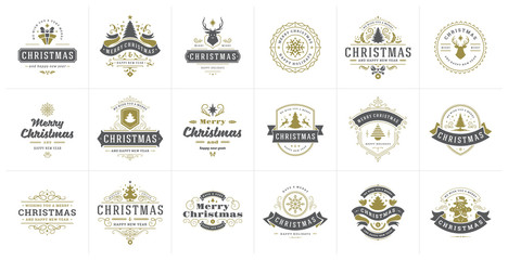 Christmas vector typography ornate labels and badges, happy new year and winter holidays wishes for vector illustration
