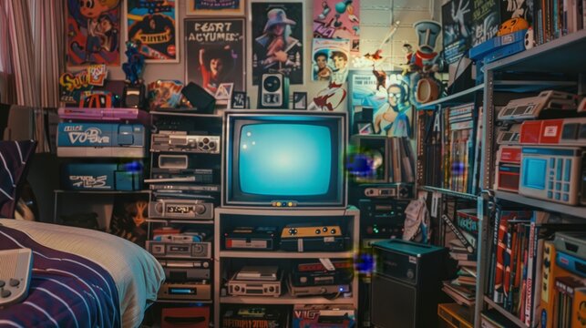 Neon-lit gaming setup with retro consoles, controllers, and a glowing "Game On!" sign, representing gaming culture.