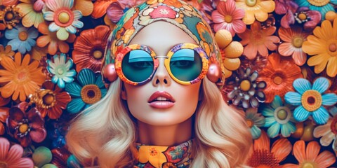 a beautiful flower power woman with cool sunglasses, fictional person created with generative ai