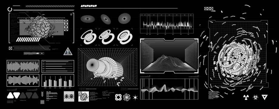 Hi-tech elements set with HUD interface and 3D shapes. Cyberpunk graphic box. Digital arts, retrofuturistic elements, typeface, 3D geometric shapes, icons, wireframe. HUD, UI, frames. Vector graphic