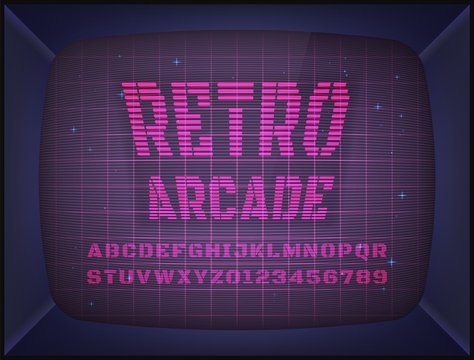 Retro arcade game machine. Screen background and font. Vector illustration.