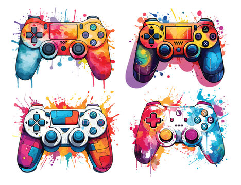 Colorful pixel art illustration of various retro gaming consoles and controllers.