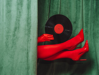 Red legs in high heels and gloves holding vinyl record behind green curtain
