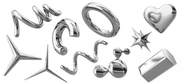 Chrome y2k abstract shapes 3d render icon set. Silver sparkle inflatable heart, star, spiral line, ring, hexagon. Liquid metal metaball of steel or mercury. Retro futuristic objects