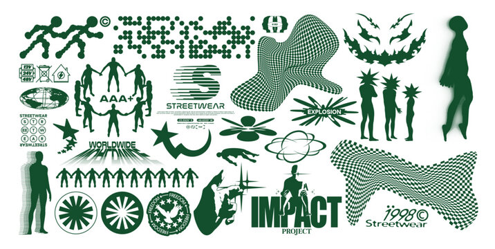 Retro futuristic design elements. collection of abstract graphic geometric symbols and objects in the year 2000 style. Templates for notes, posters, banners, stickers, business cards, logo.