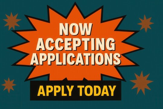 Attention-grabbing banner with NOW ACCEPTING APPLICATIONS and APPLY TODAY promotion, retro comic style, compelling recruitment offer.