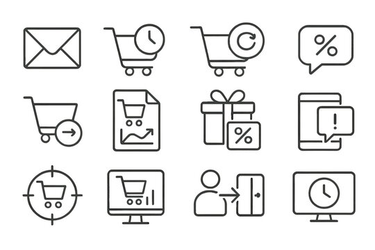 Abandoned Cart Icons. Line style icons of abandoned cart recovery: email reminder, cart with clock, return offer, message with