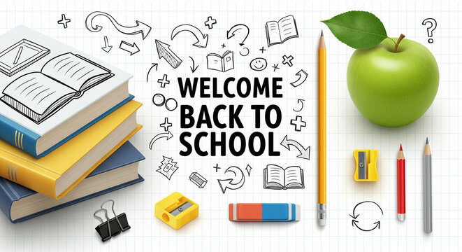 Inviting back to school composition featuring books, apple and writing elements